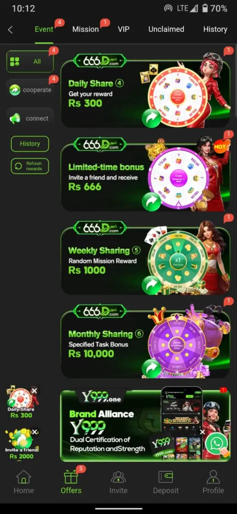 Invite your friends to join and get instant bonuses. The referral program helps you earn passive income while your friends enjoy gaming on 666D.