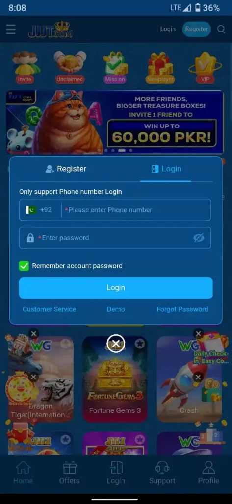 - Press the login option to access your game account.