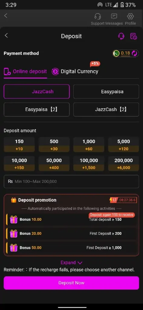 The app supports Easypaisa, JazzCash, and direct bank transfers.