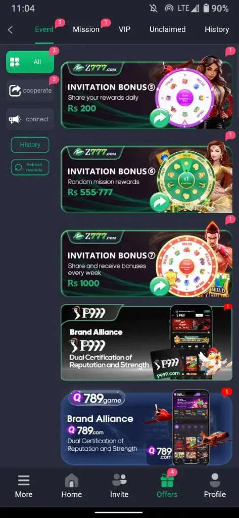 Invite your friends to join the Z777 community and earn exciting referral rewards. You can invite more users if you earn extra money in this game.